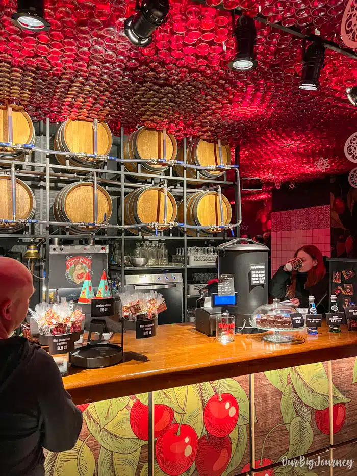 The atmosphere at Pijana Wiśniaat is relaxed and friendly. The interior was full of red accents and classic décor to match the drink. It’s is a fun and quirky place to stop at, breaking up museum visits and walking tours with something lighthearted and delicious. If you’re curious about local drinks beyond beer or coffee, this is a unique place to try something distinctly Central European.
