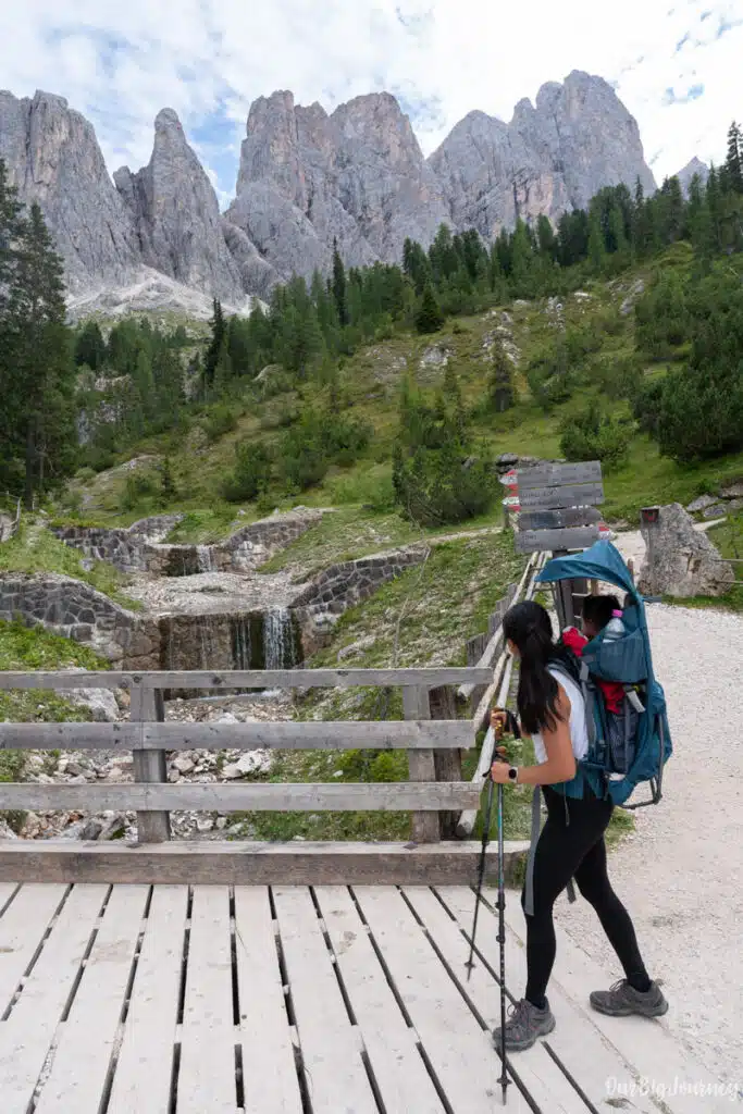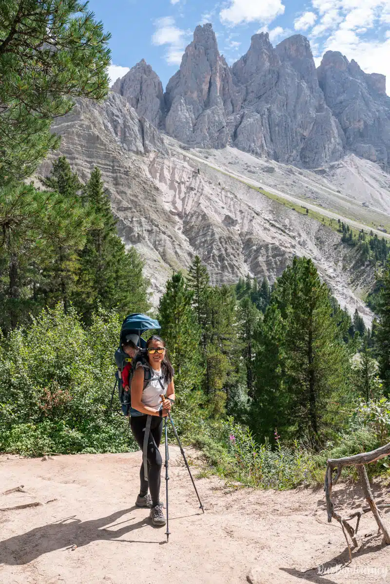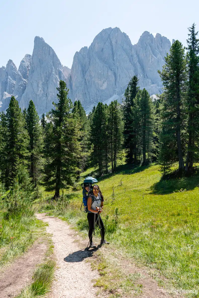 In this post, we talk about why we liked it, how to get there, trail details, what to expect along the way, and many other things. We did this hike with our baby Lara. In can you want extra advice for the Dolomites with kids, check our Full Guide. Keep reading!