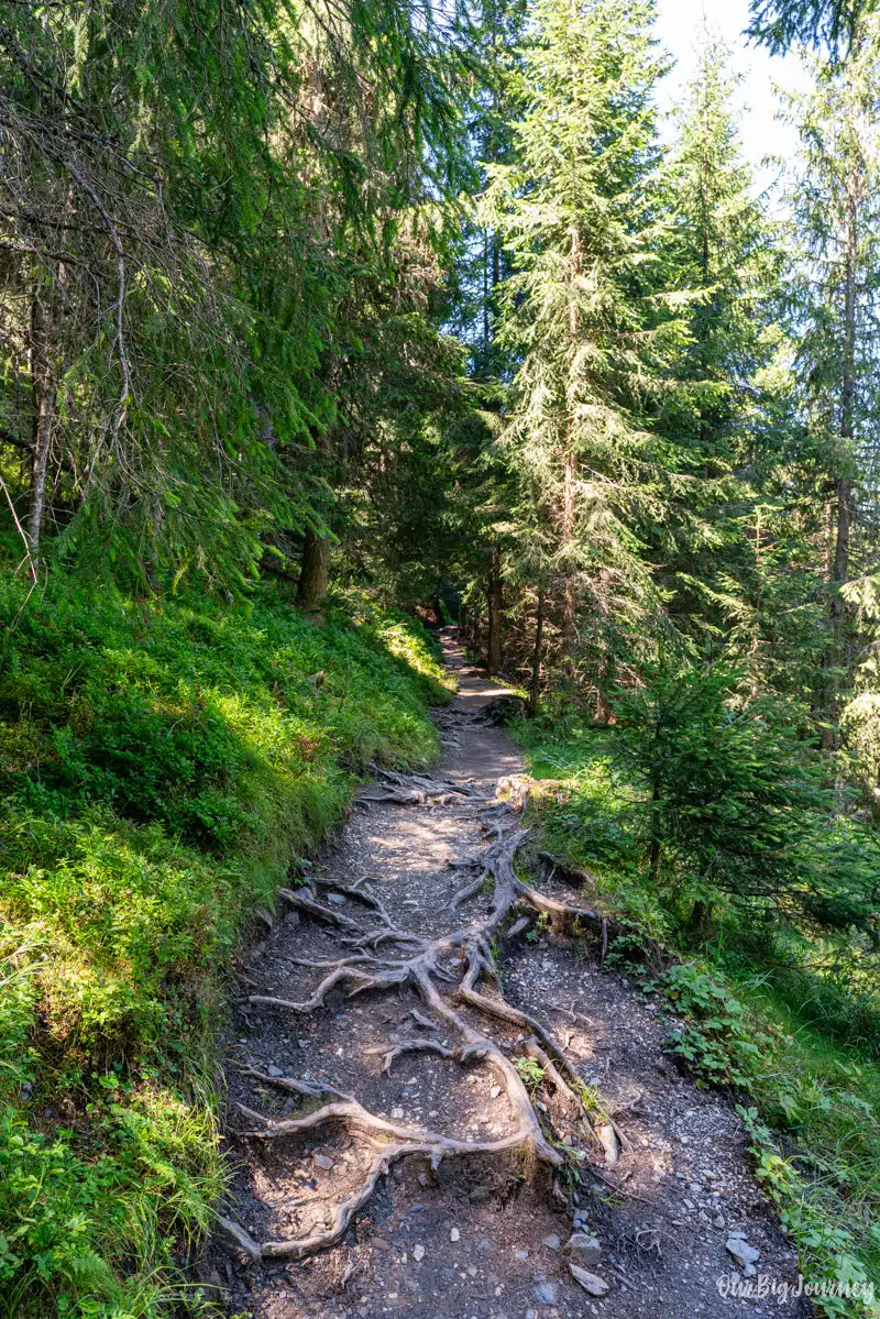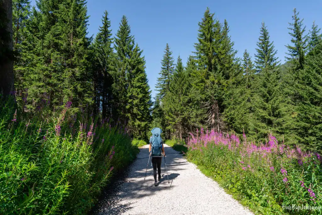 Once we packed everything for the day, including Lara’s things (this always requires extra time), we started our hike following Trail #36. At first the path is quite flat, and soon goes through the woods with a lot of shade coverage. The environment is different from the typical views of the Dolomites, and gave us more Pyrenees / mid-mountain vibes, with more forest.
