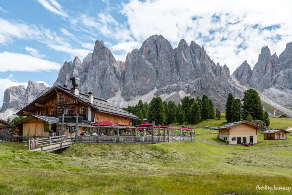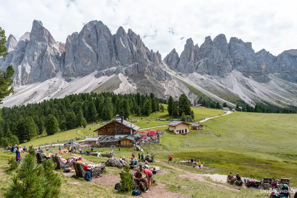 For us, this was the highlight of the hike. Rifugio delle Odler or Gisleralm is located at 1996 m above sea level and perfectly located at the heart of the Puez-Odle Nature Reserve. The views from there are extremely photogenic. But not only that, the Rifugio has a meadow with many lounge chairs and wood sofas, to rest and enjoy the breeze and sun with exceptional views.