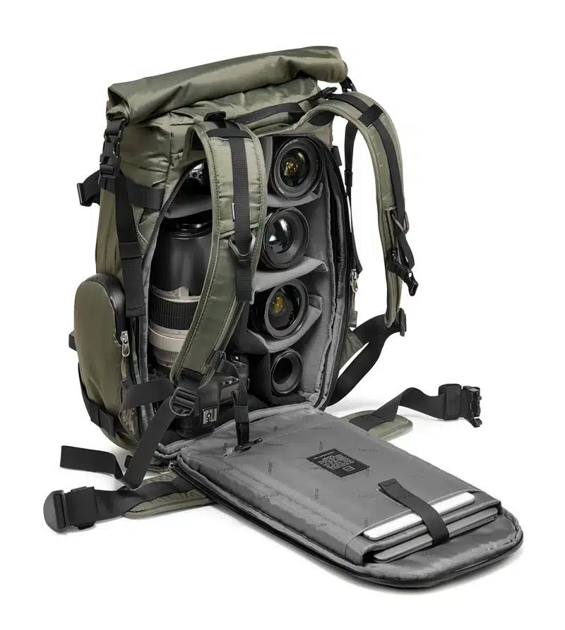 And finally, the last option of the group, the Gitzo Aventury 30L Camera Backpack. This model offers similar characteristics to other backpacks here: straps, water resistance, internal dividers, tripod holder, good materials,… the upper part of the backpack is also expandable to gain some extra space. It’s a solid and comfortable option for those who love the military green.