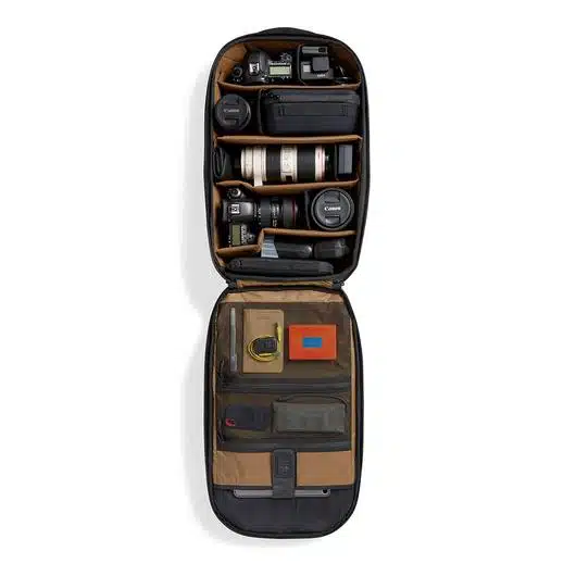 Good design, optimized space, multiple pockets, outstanding protection, 2 lateral pockets and straps… The Atlas Athlete Pack has it all! While it’s not water sealed, it will resist light rain, and I personally love the expandable top access. It was awarded by National Geographic as one of the best camera bags for travelers. The downside is the price. For its deorbited price, there are (I think) other better options.