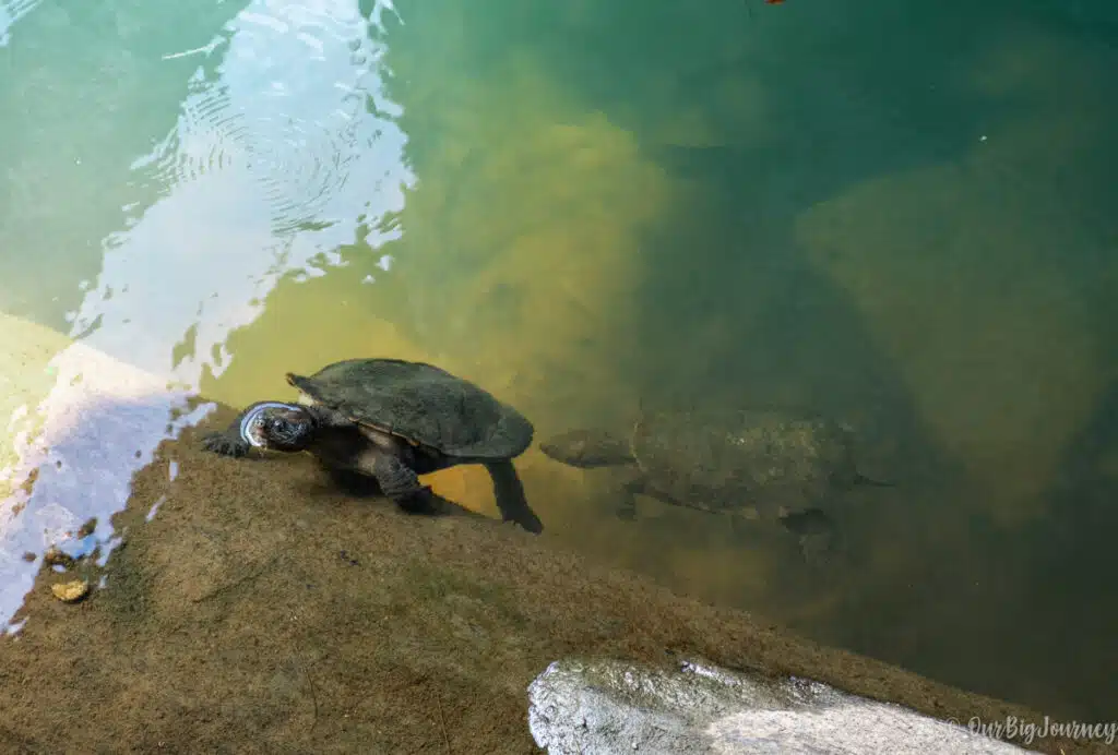 When we came back to the observation platform, we waited for another extra 10 minutes without success. We observed waves in the water, bubbles, and saw multiple turtles and fish, but the platypus wasn’t there. Ellen was quite disappointed, because we didn’t know the most important thing to spot the platypus: They are active from 4 to 8 am and from 3 to 9 pm in the evening. Outside of these intervals, it is so rare to see them. Wistfully, it was 1 pm for us that day.