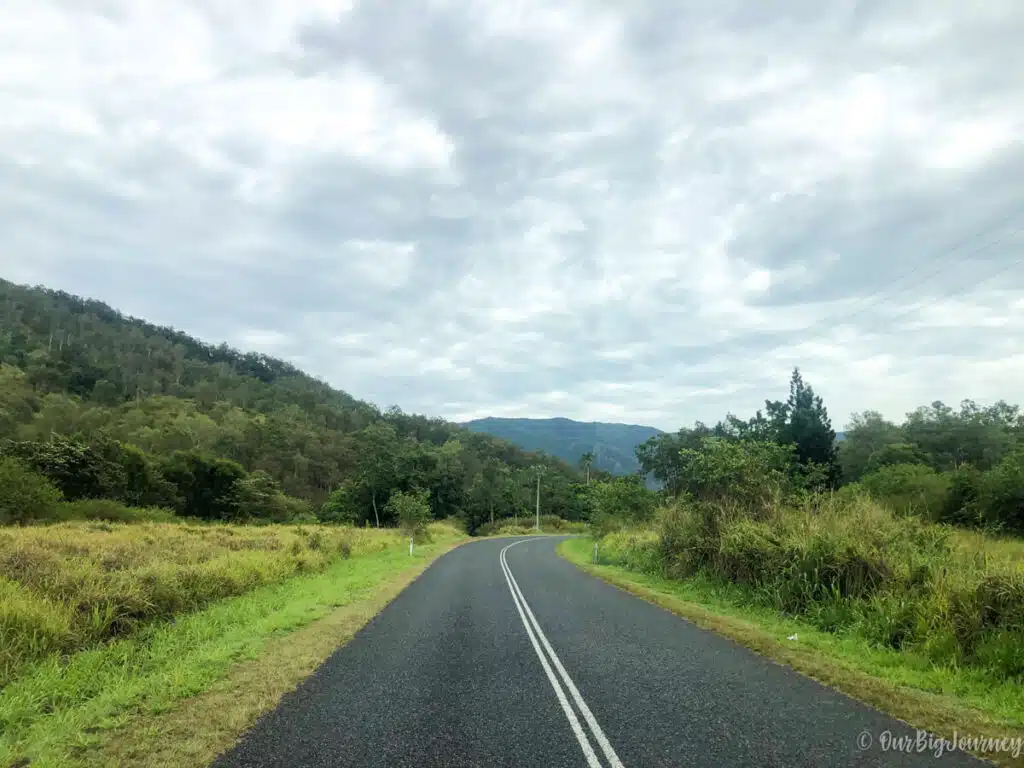 After spending one day in 1770 & Agnes Water, we drove some hours directly to Finch Hatton, skipping Mackay City. We enjoyed the drive in this region because the rainforest starts to grow massively thanks to the humidity. Here, the green mounds at the background contrast with the dry infinite roads.