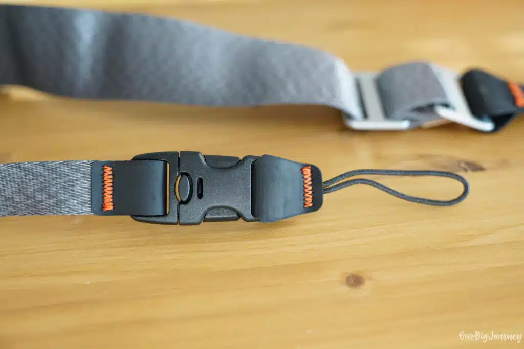 The strap uses a 45 mm width webbing (like a seatbelt) which feels stronger and more supportive than thinner alternatives you may get bundled with cameras. When I first tried the straps of my first camera: the Sony 5100 it was thin, very thin, I even though the camera was very light, I could feel its weight. Since then, I’ve always preferred wider straps that distribute the weight better. Simple physics.