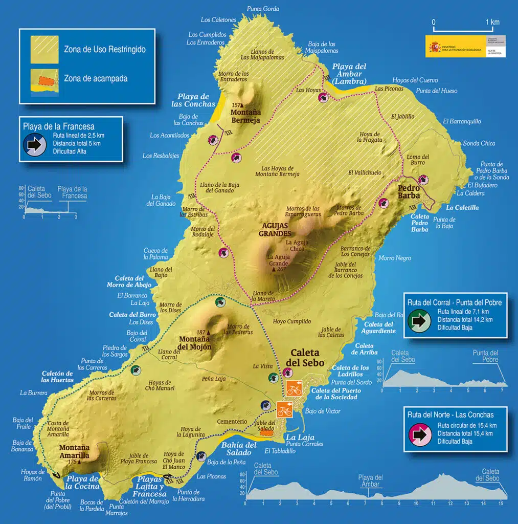 If you’re staying only one day and plan on renting bikes (and no 4×4) we suggest doing the Purple northern route counter-clock wise. By doing this, you ride as much as the Green route but have the chance to visit more places, and you leave Playa de las Conchas for the last stop.