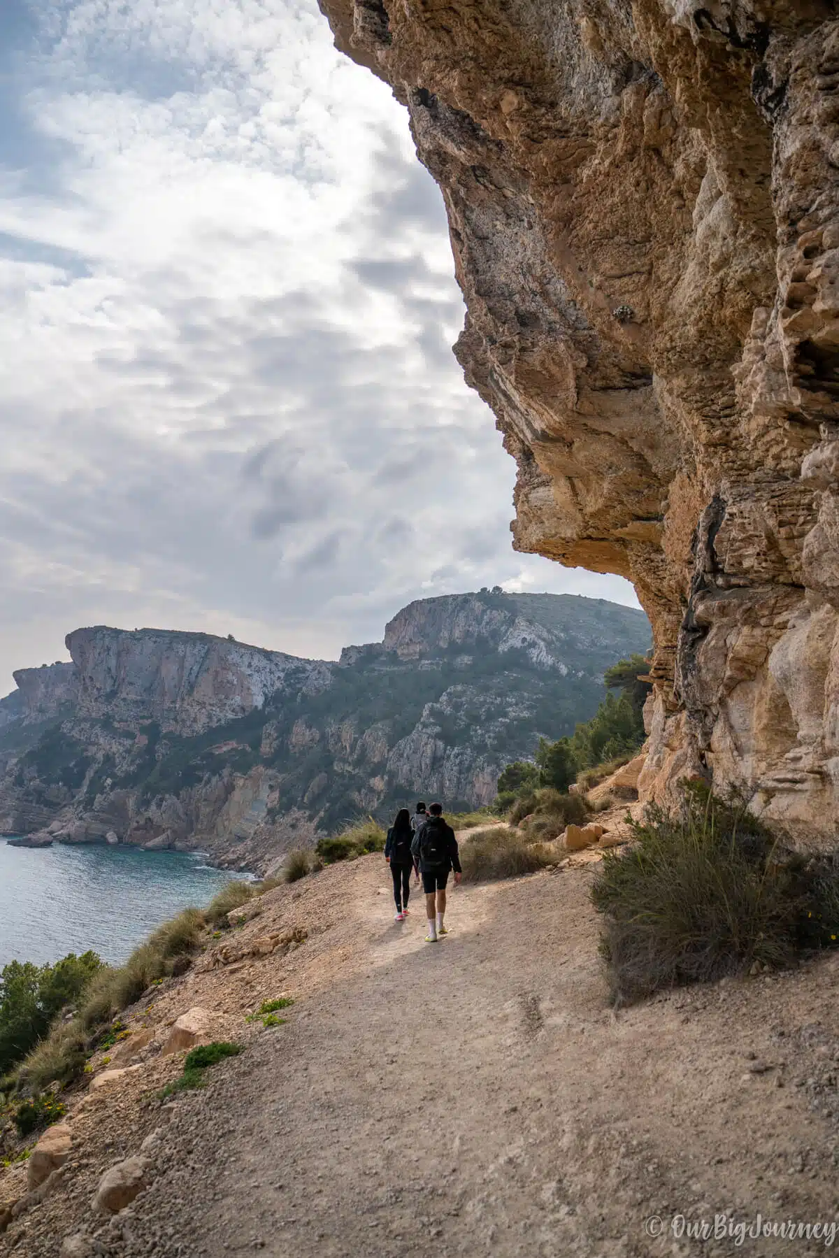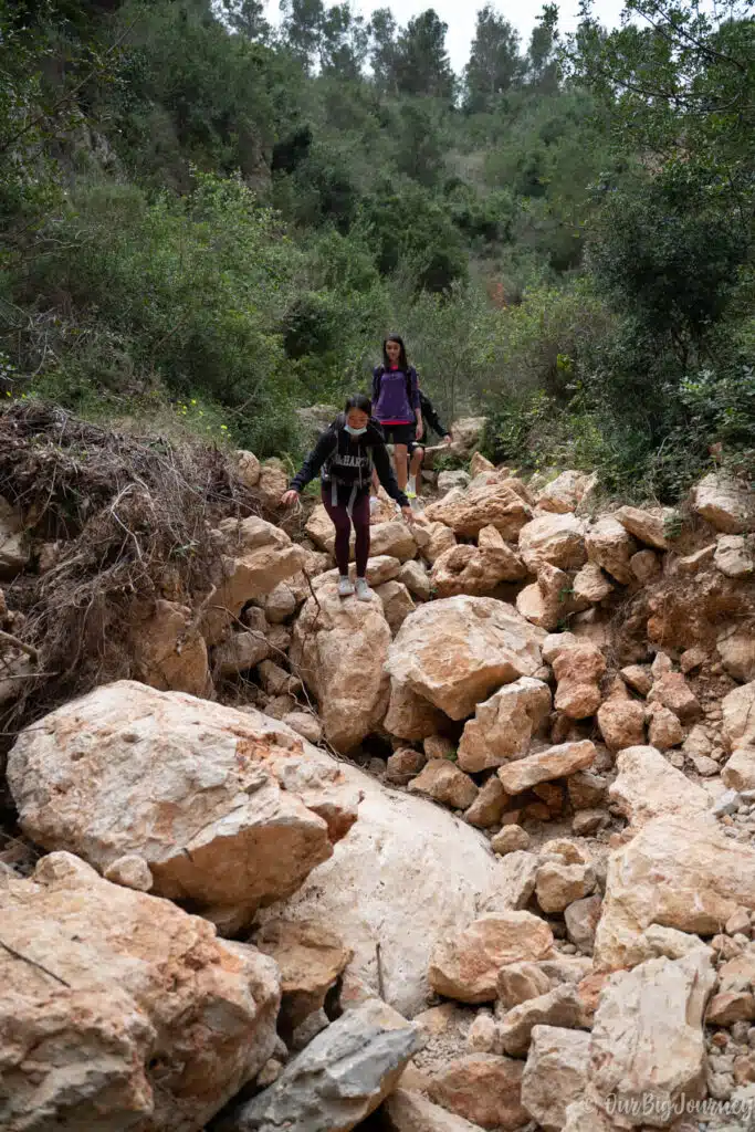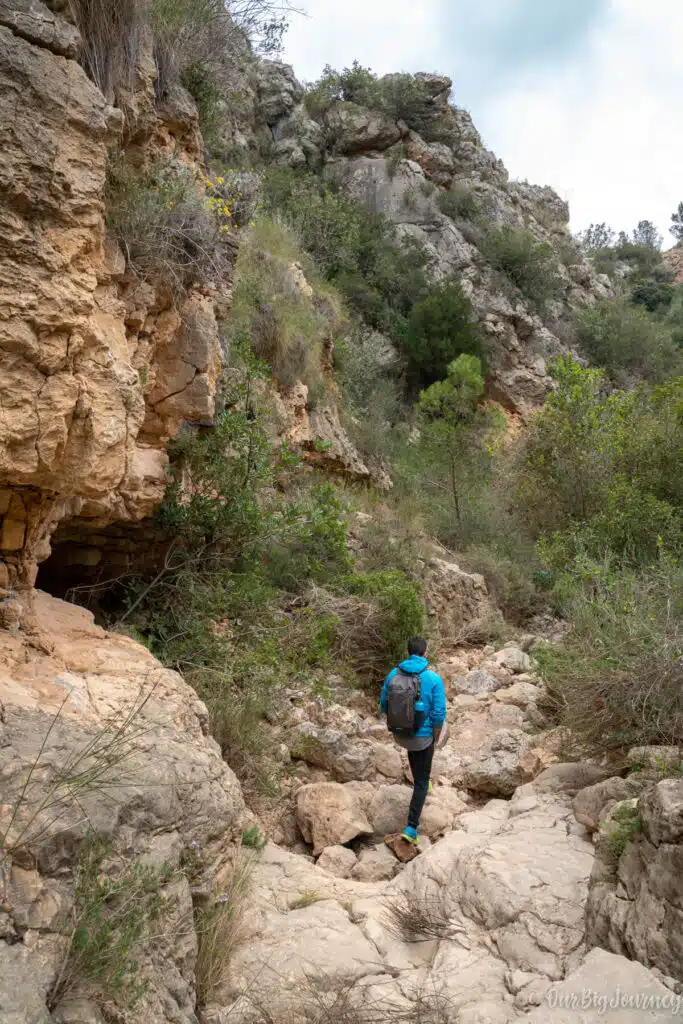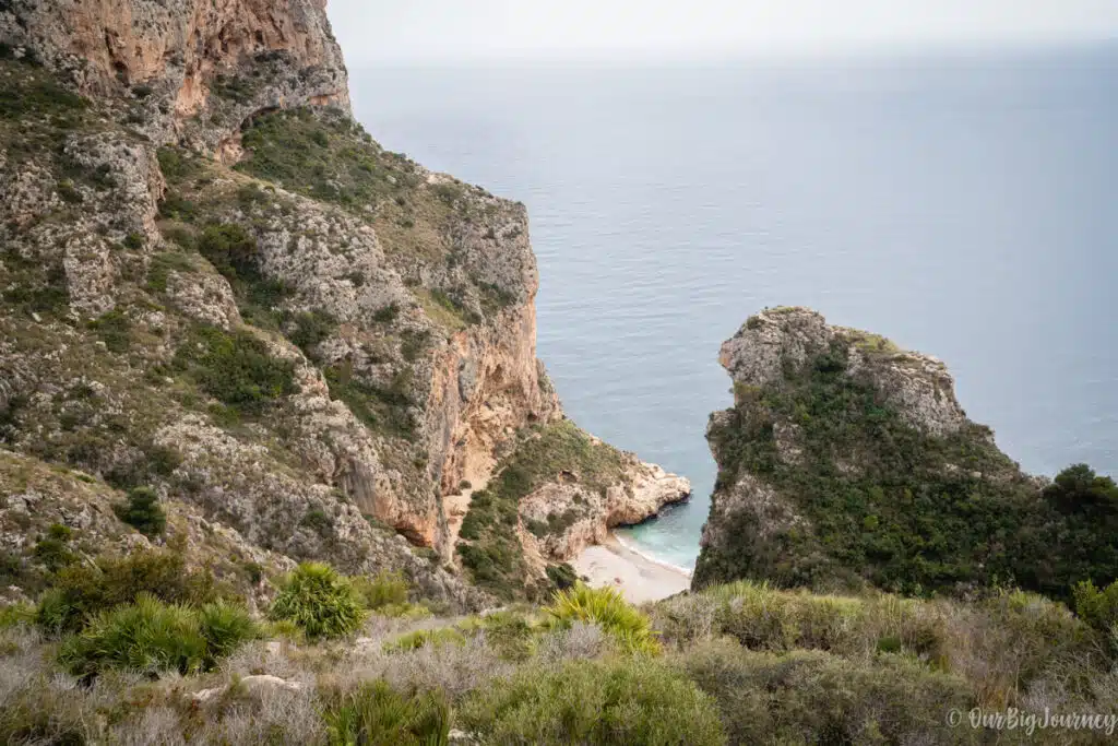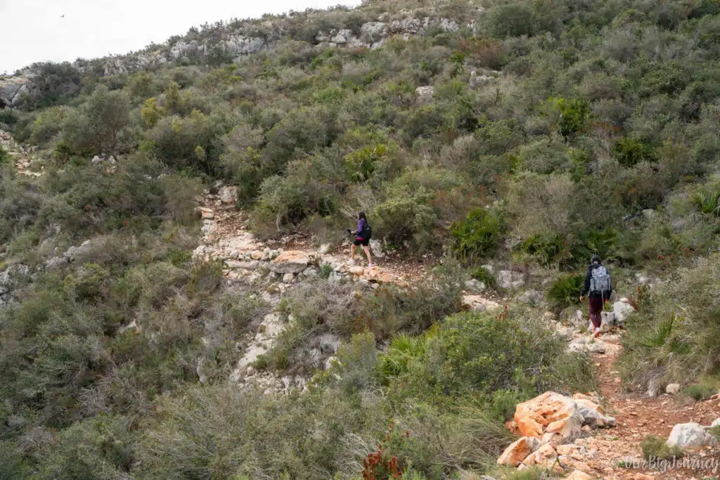 Following the path leaving behind Morro Falquí, we started to go down to reach Cala los Tiestos. This cove is so unique that you can only reach it by foot or kayak from the neighbouring beach, Cala Moraig. I’d never been there and I recommend only doing the hike if you’re hiking. Avoid going there with flip-flops, swimming clothes, freezer, and your umbrella. I mean… you can do it, but read the following first.