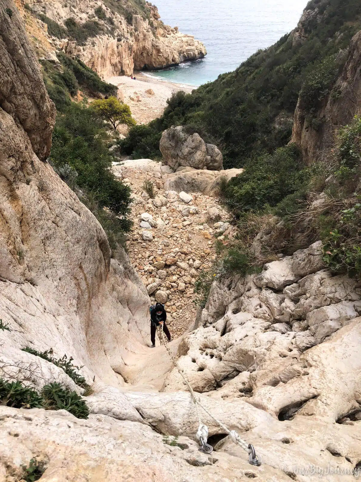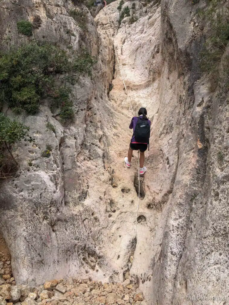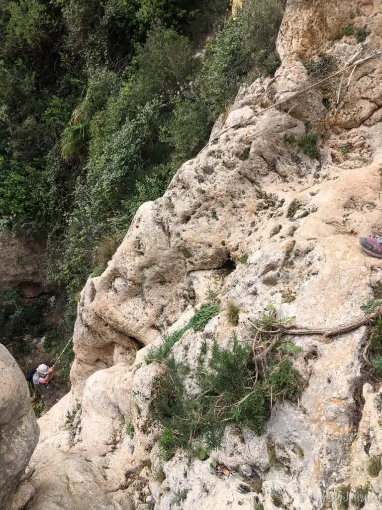 Once you have walked for about 10 minutes over hard rocky terrain, you will see the little Cala los Tiestos in the background. To get to the shore, the only way is to rappel down three rock walls. ⚠️ These drop-offs are 7, 10 and 10 meters each and unless you’re a mountain enthusiast, you’ll see they are no joke.